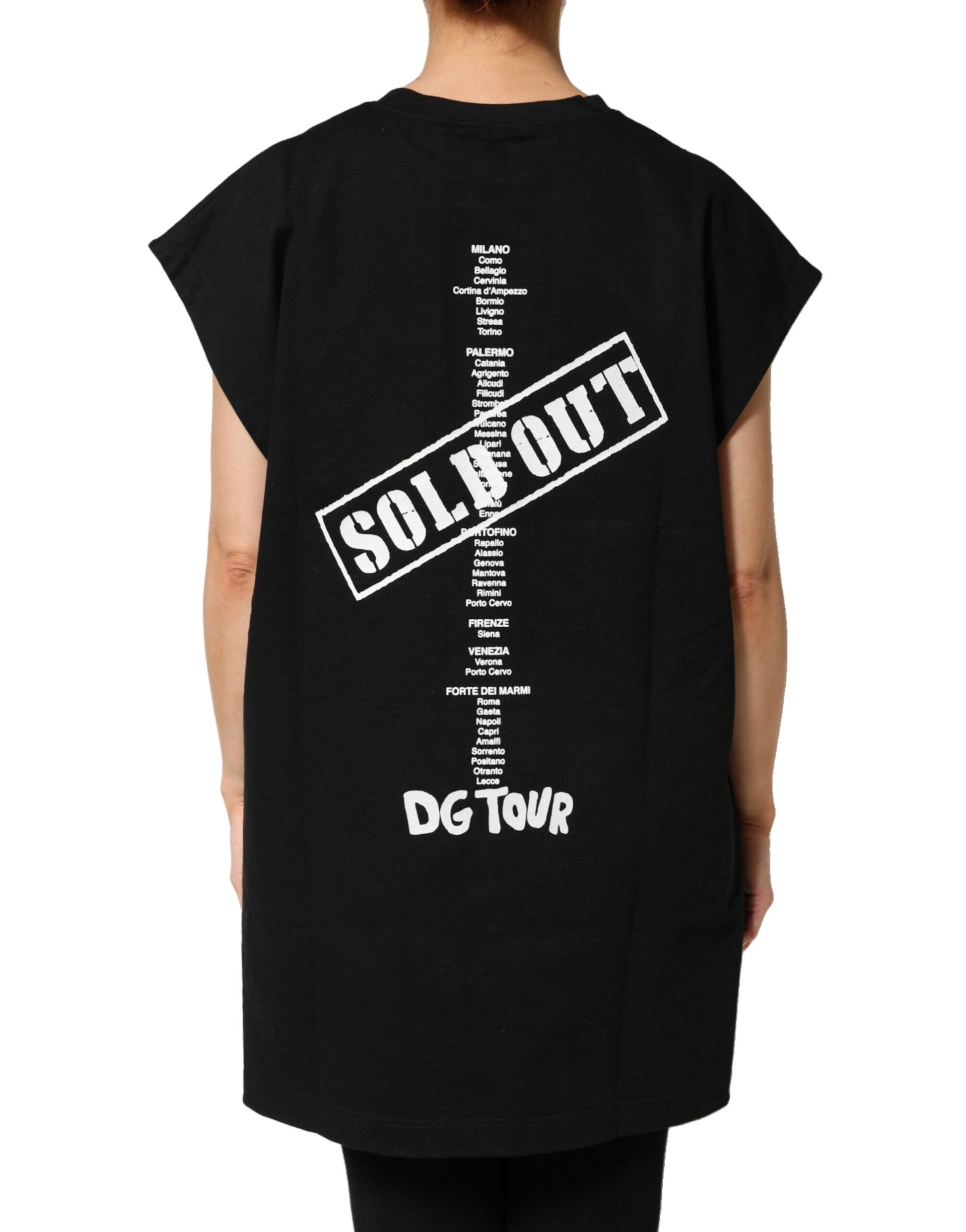 Gorgeous brand new, 100% Authentic Dolce & Gabbana sleeveless T-shirt from the exclusive DG Fashion Tour collection. Made from 100% premium cotton, this piece features a bold front “D&G Fashion Tour” graphic print and a “Sold Out” tour cities print on the back. Designed for a relaxed, oversized fit, it combines streetwear style with Italian luxury.