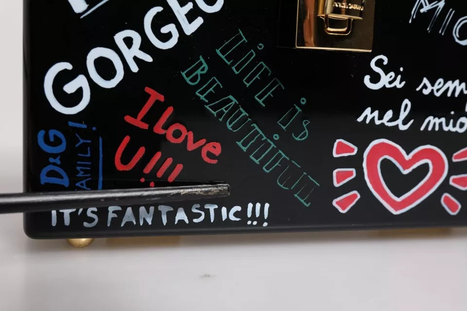 Absolutely stunning, 100% Authentic, Dolce & Gabbana graffiti wood clutch featuring a padlock fastening with an iconic small enamel flower embellishment.