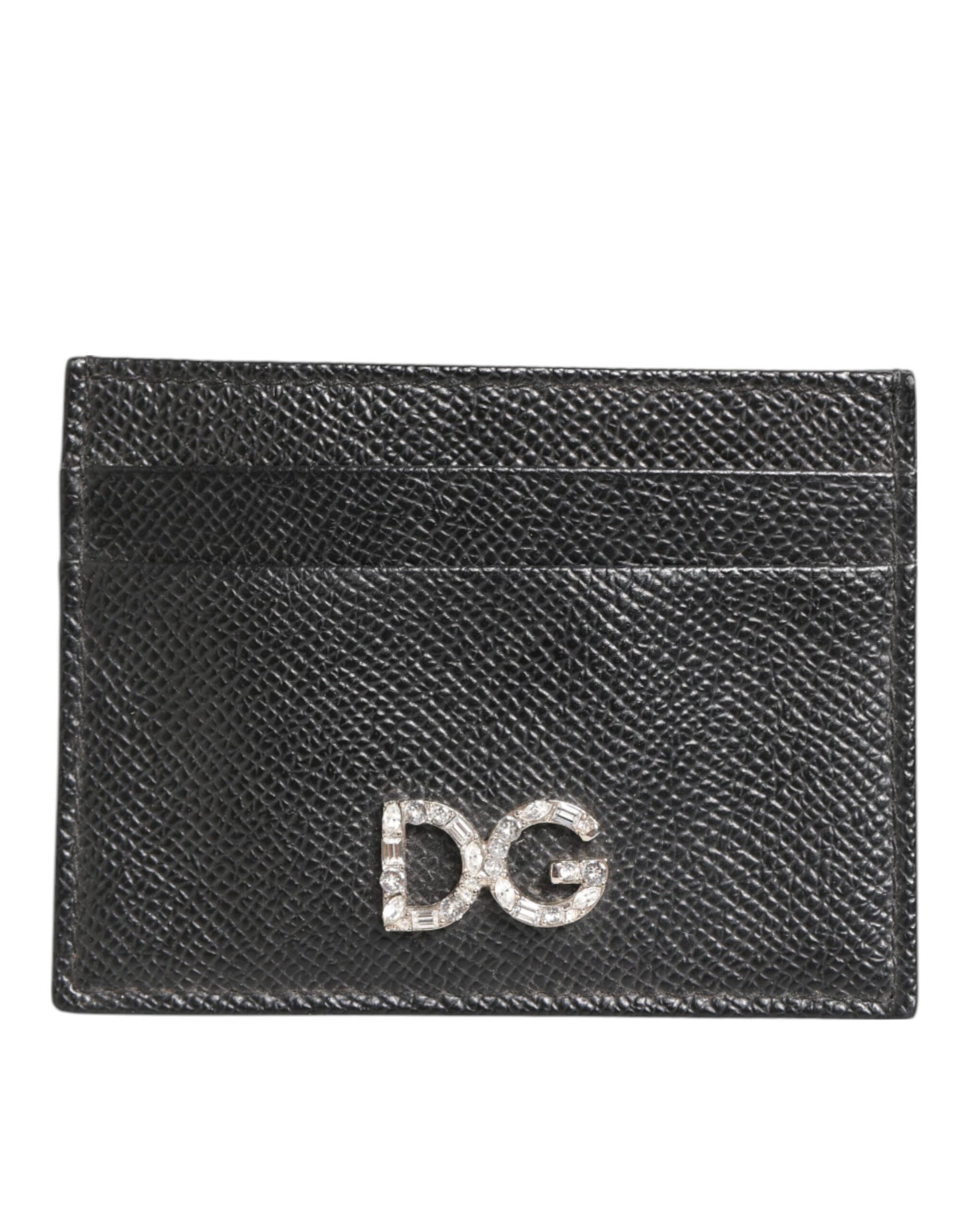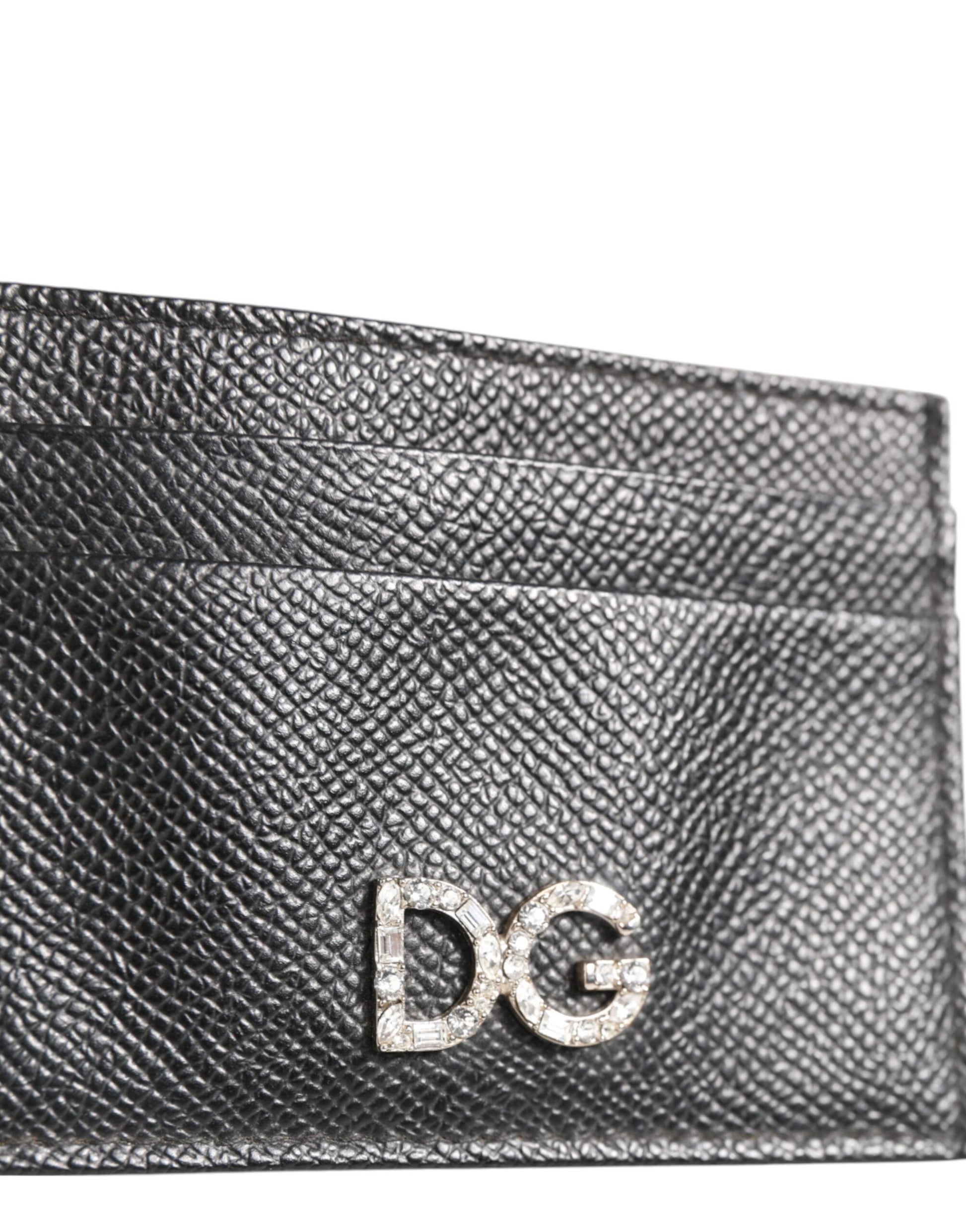 Black Leather Crystal DG Logo Embellished Card Holder Wallet