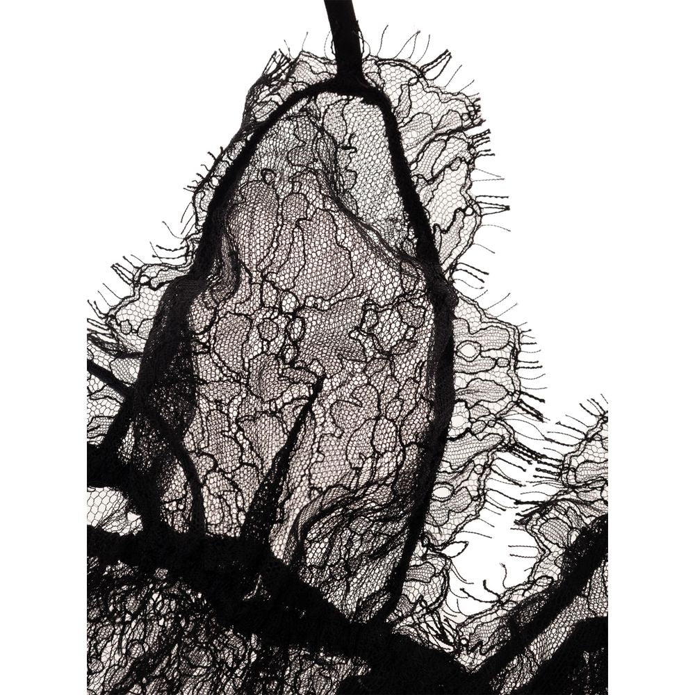 Allover lace triangle top, elasticized cord and shoulder straps, open front.