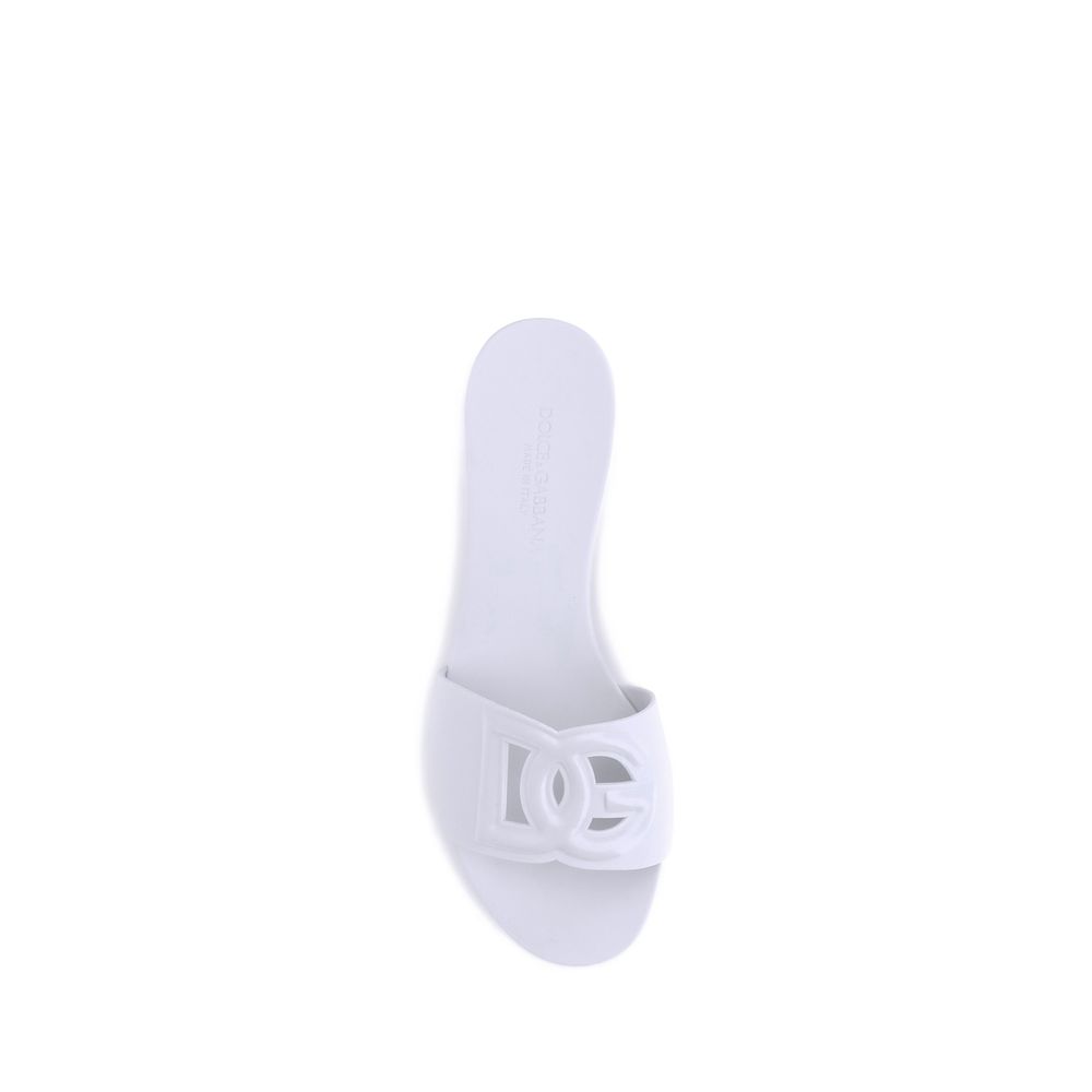 The Dolce&Gabbana Sandals feature an open toe and a slip-on design for a comfortable and quick fit. The front band is enriched by the brand logo with cut-out details, which add a distinctive graphic touch. The flat sole ensures daily comfort, while the insole is personalized with the Dolce&Gabbana logo for an elegant and recognizable detail.