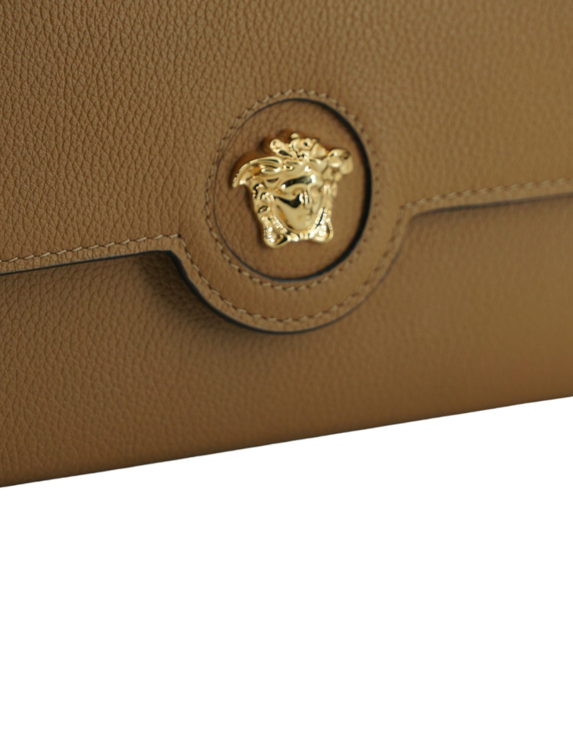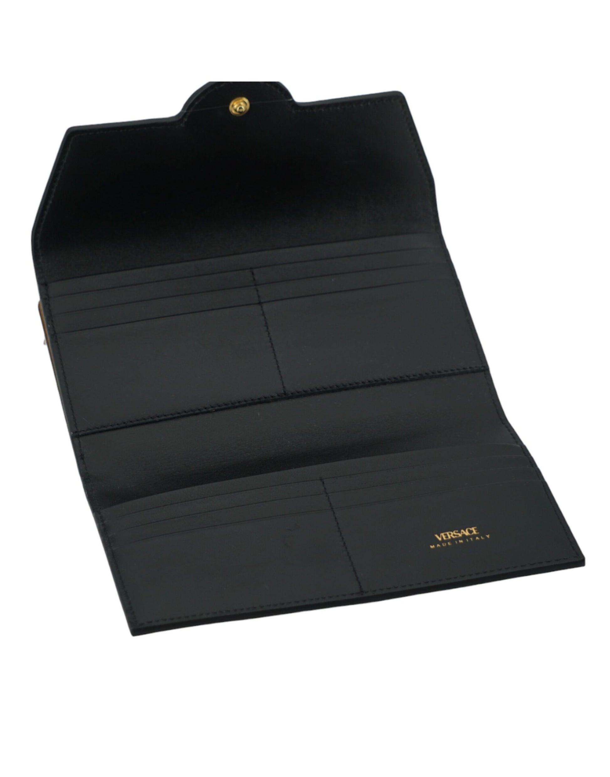 Indulge in the luxury of a brand new, 100% authentic Versace wallet, complete with original tags and box. An epitome of elegance, this exquisite accessory features the iconic Medusa head logo, a symbol of Versace’s heritage and craftsmanship. With 12 card slots, two internal slip pockets, and an external zip compartment, it’s designed to organize and secure your essentials in style. The wallet’s sophisticated brown calf leather is complemented by gold-tone hardware, adding a touch of glamour to your everyday ensemble.