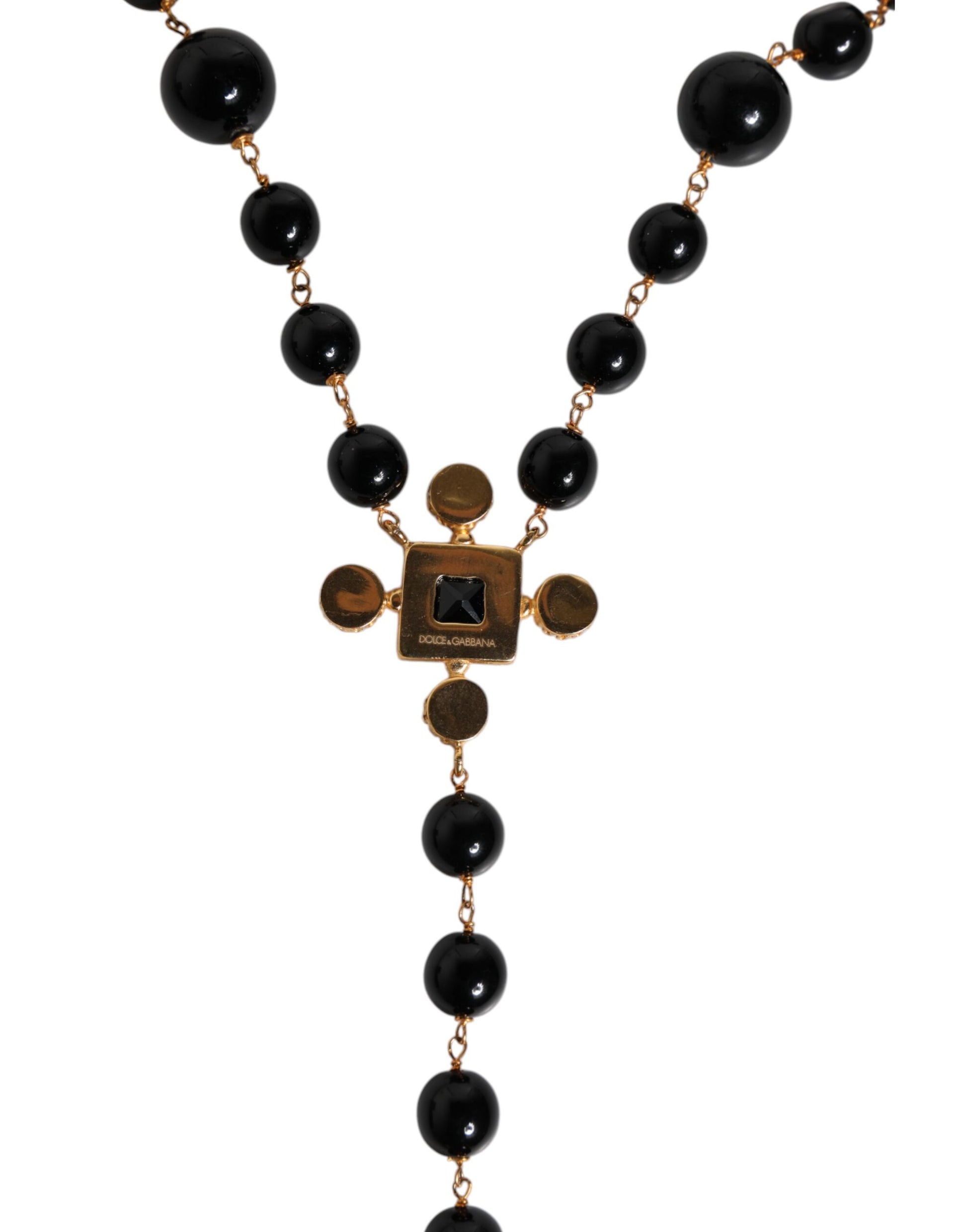 Gold Brass Black Beaded Chain Rosary Pendant Necklace