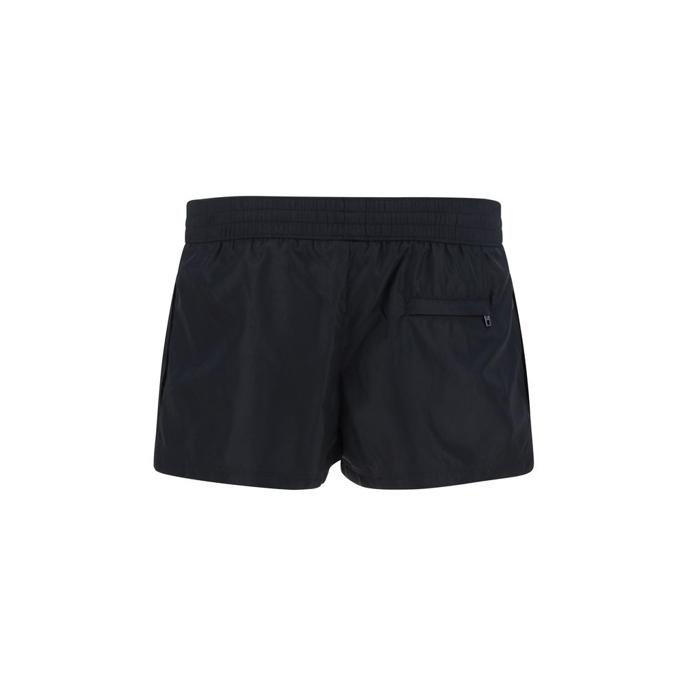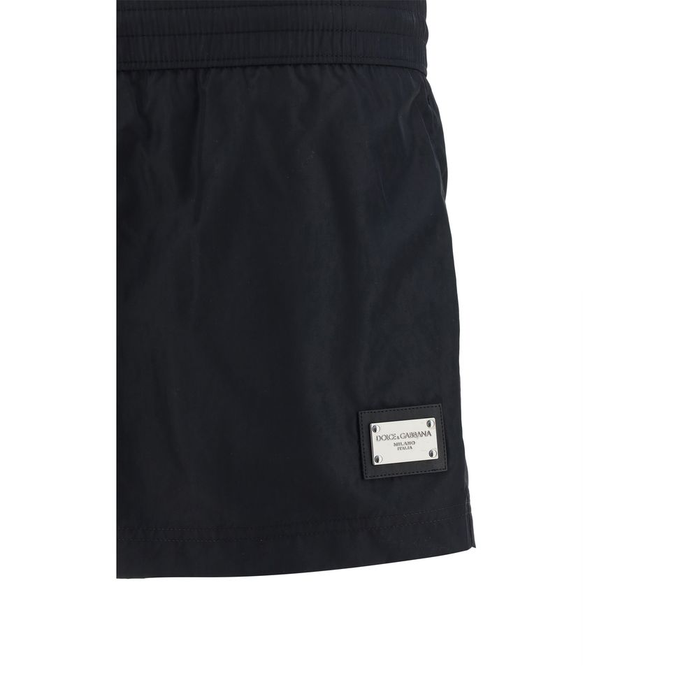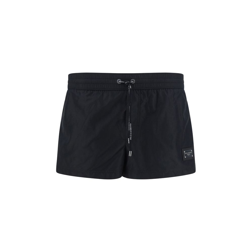 Swimsuit by Dolce&Gabbana, elasticated waistband with contrasting logoed drawstring, slit pocket on the back, metal plate with iconic D&G monogram of the brand engraved and applied on the front, monochrome pattern.
