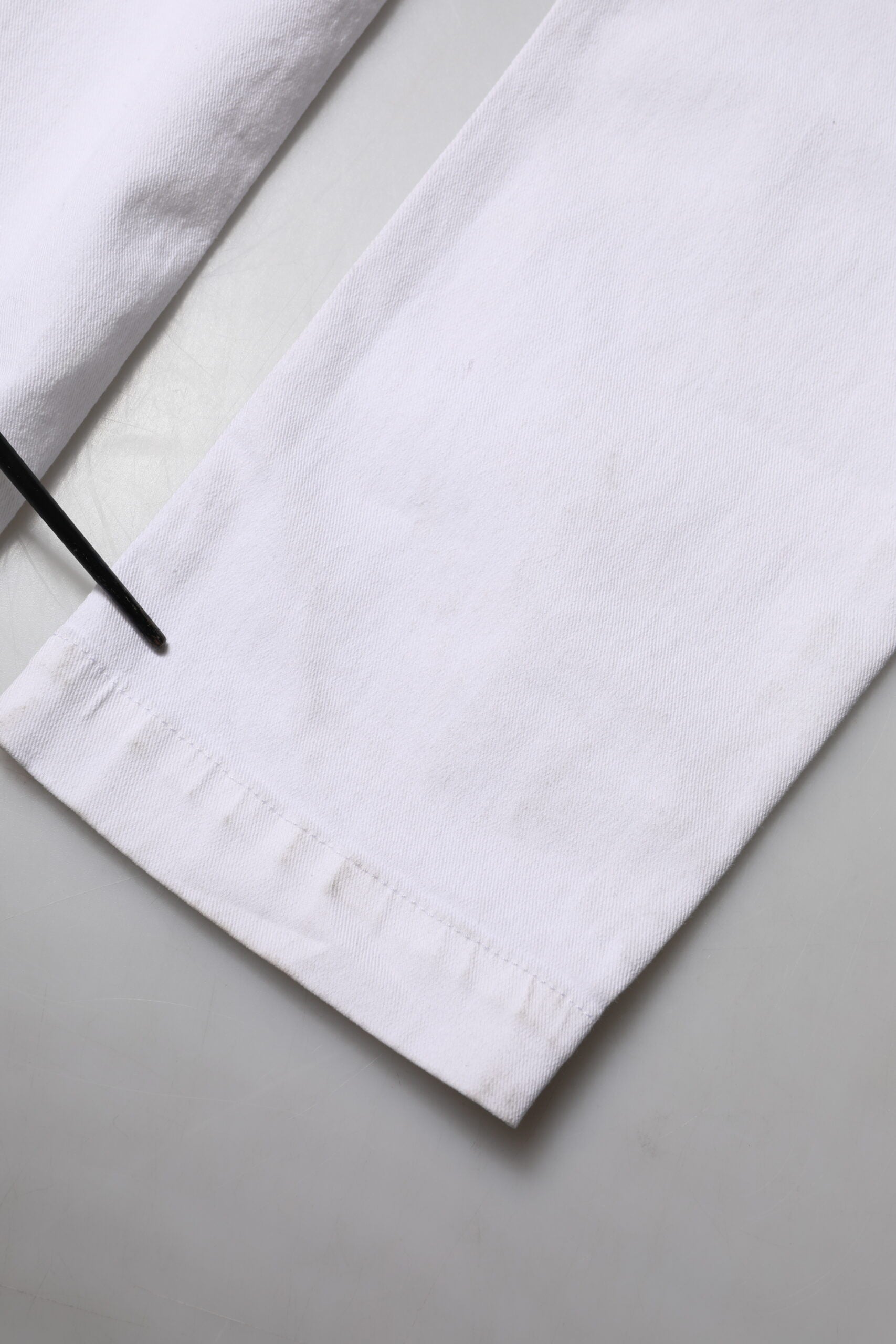 This item has a minor defect, there are marks on the lower end of the jeans (see pictures for details).