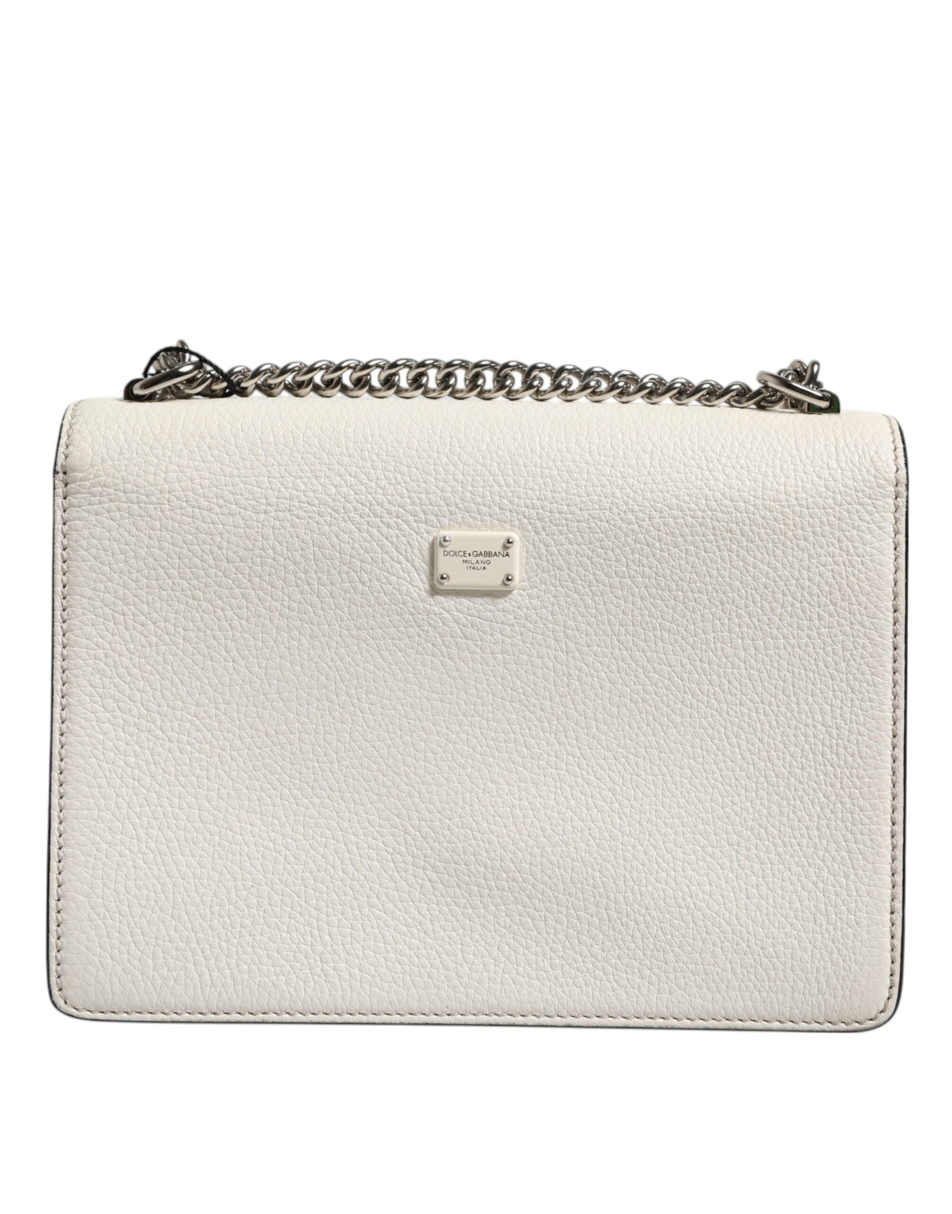 Gorgeous brand new, 100% Authentic Dolce & Gabbana bag is crafted of luxuriously grained calfskin leather in white. The bag features a polished silver chain link shoulder strap with a leather shoulder pad and a facing classic flap with the turn lock closure.